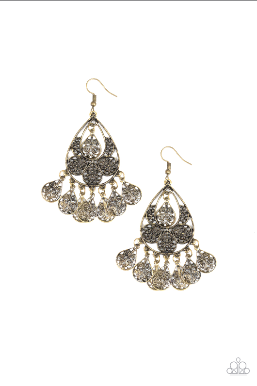 Filled with filigree details, ornate teardrops swing from the top and bottom of a decorative brass teardrop frame, creating a whimsical fringe. Earring attaches to a standard fishhook fitting.