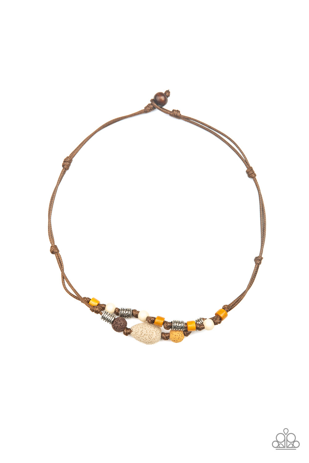 A collection of colorful wooden beads, silver accents, and earthy lava stones are knotted in place along two shiny brown cords for an urban look. Features a button loop closure.