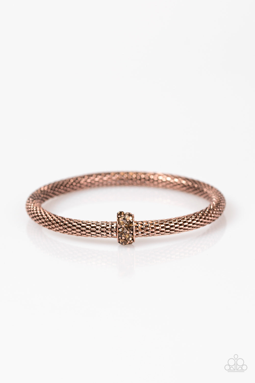 Glistening copper bars arc across the wrist, coalescing into an airy cuff.